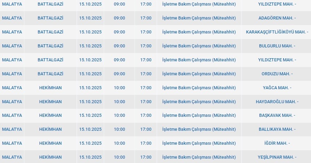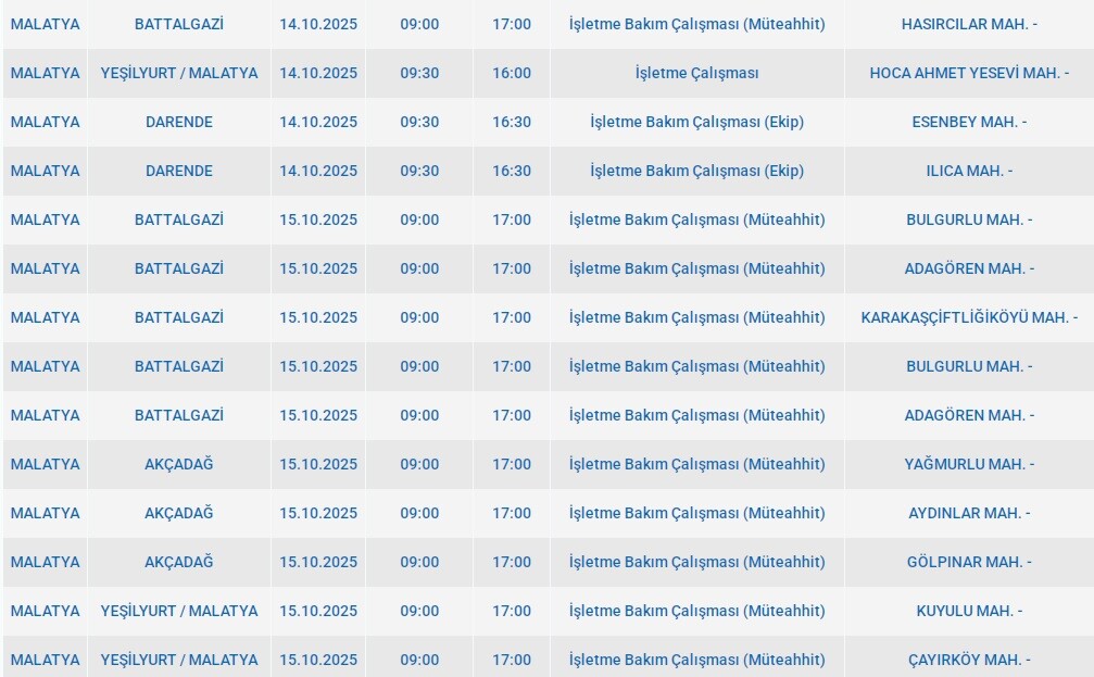14-15-16 Ekim Günleri Yeşilyurt , Yazıhan, Pütürge ve Darende'de Elektrik Kesintisi Olacak