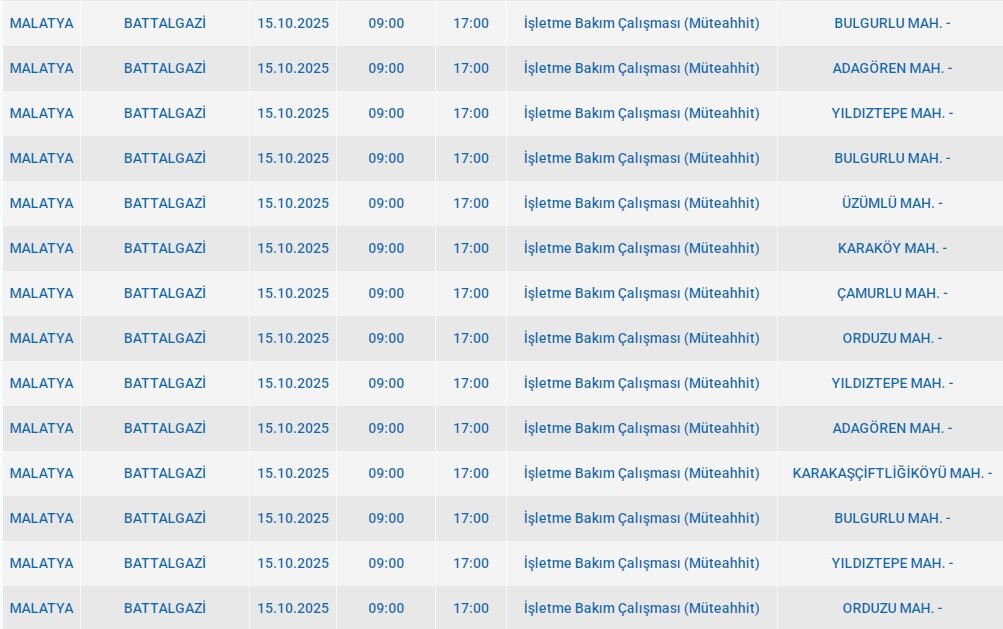 Fırat EDAŞ, Akçadağ, Battalgazi, Darende, Hekimhan, Kuluncak ve Yeşilyurt İlçelerinin Bazı Mahallesinde 14-15-16 Ekim Tarihleri Arasında Saat 09.00 İle 17.00 Arasında Elektrik Kesintisi Yaşanacağını Duyurdu.
