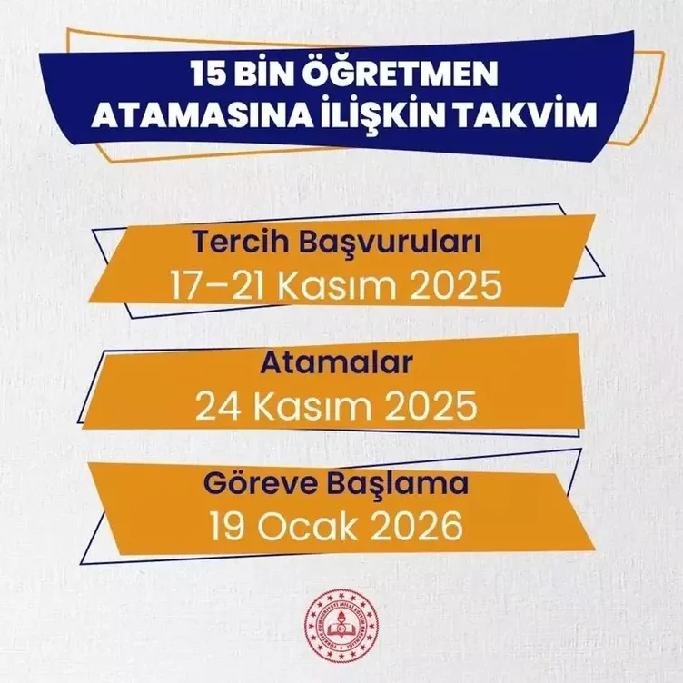 15 bin sözleşmeli öğretmen istihdamı kapsamındaki tercih başvuruları, 17 - 21 Kasım 2025 tarihleri arasında alınacak olup atamalar 24 Kasım 2025 tarihinde yapılacak.