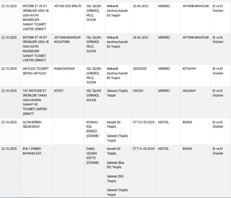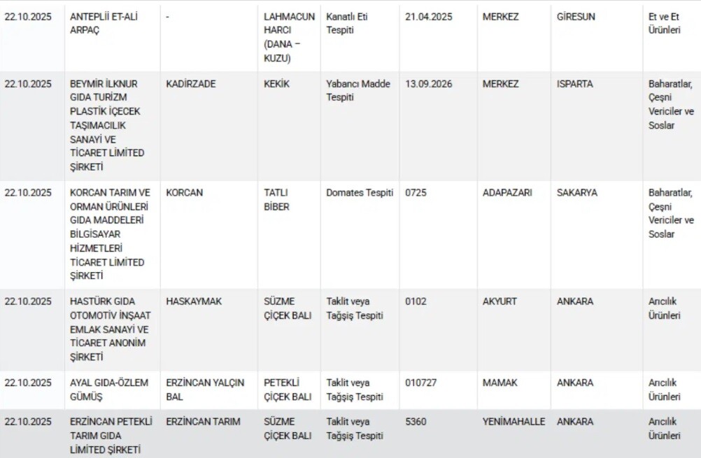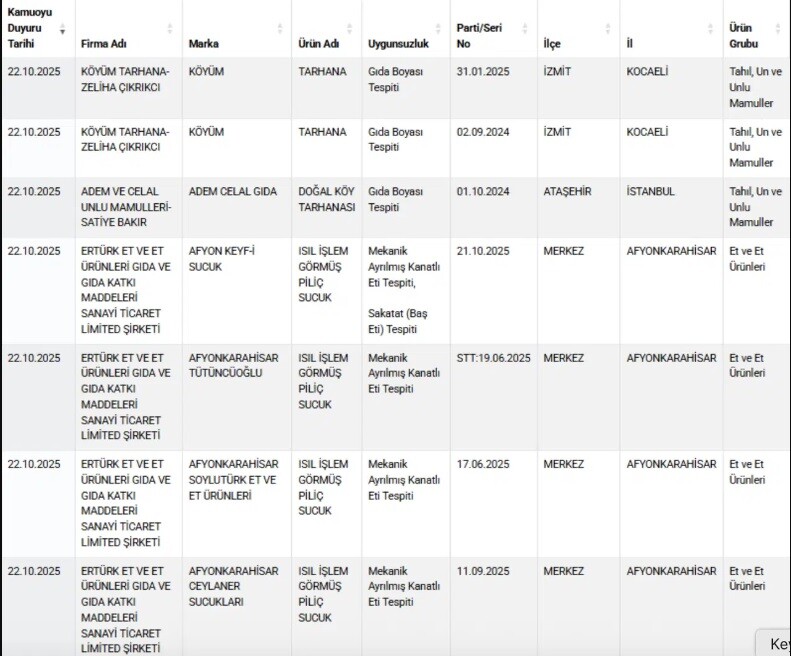 22 Ekim 2025 tarihli güncel listede özellikle sucuk, börek, tarhana ve lahmacun gibi ürünlerde yapılan ciddi hileler dikkat çekti.