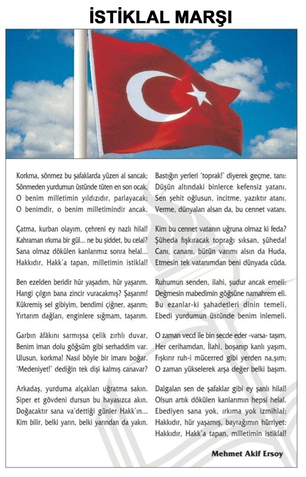 İstiklal Marşı, Türk milletinin esareti asla kabul etmeyeceğinin, her şart altında istiklaline sahip çıkacağının ilanıdır. Bu marş, Kurtuluş Savaşı’nın ruhunu, milletimizin fedakârlığını ve bağımsızlık uğruna verilen büyük mücadeleyi ebediyete taşıyan bir destandır.