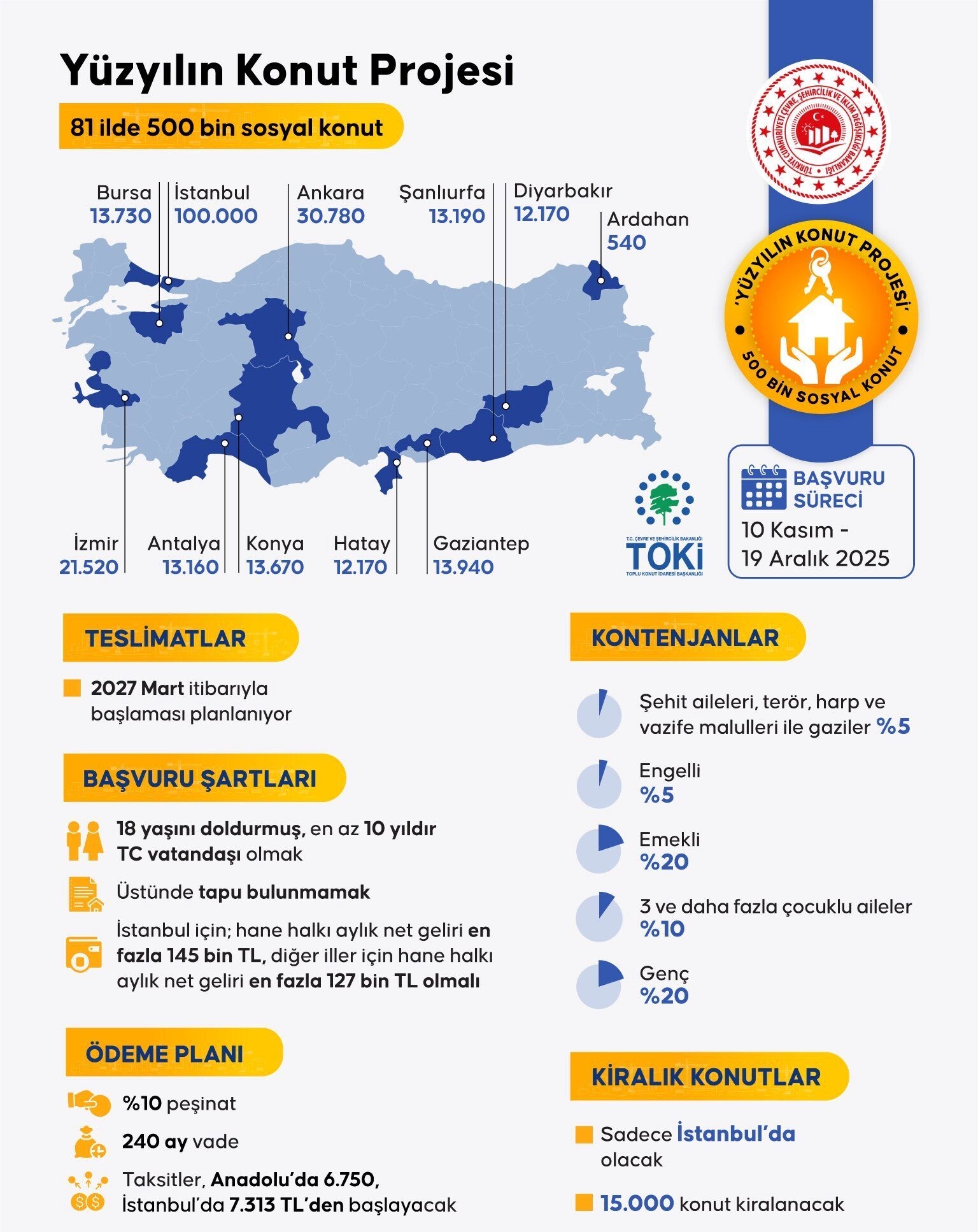 Cumhurbaşkanı Erdoğan, yeni konut projesinin detaylarını da açıklayarak, şunları kaydetti: “Türkiye Yüzyılı’nda Yüzyılın Konut Projesi’ni hayata geçiriyor, 500 bin sosyal konut seferberliğimizi başlatıyoruz. Projemizle 81 ilimizin tamamına toplam 500 bin konut yapacağız. Bu 500 bin konutun 100 binini İstanbul’a ayırdık. İstanbul’umuzun her iki yakasında toplam 100 bin konut inşa edeceğiz. Ankara’ya 30 bin, İzmir’e 21 bin, Bursa, Gaziantep ve Konya’ya 13 bin, Hatay ve Diyarbakır’a ise 12 bin yeni yuva kazandıracağız. Emanetlerine gözümüz gibi baktığımız şehitlerimizin kıymetli ailelerine, kahraman gazilerimize ve engelli kardeşlerimize yüzde 5 oranında ayrı bir kontenjan ayırdık. Aynı şekilde 3 ve daha fazla çocuğu olan ailelerimize yüzde 10’luk bir kontenjan tahsis ettik. Yıllar yılı çalışmış, emeğiyle hizmetiyle bu ülkeye değer katmış emeklilerimizi tabii ki unutmadık. Emekli vatandaşlarımıza da proje kapsamında yüzde 20 kontenjan ayırdık.”