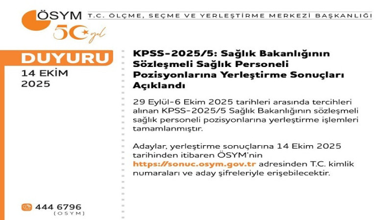 29 Eylül-6 Ekim 2025 tarihleri arasında tercihleri alınan KPSS-2025/5 Sağlık Bakanlığının sözleşmeli sağlık personeli pozisyonlarına yerleştirme işlemleri tamamlanmıştır.