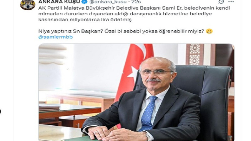 X Platformunda Ankara Kuşu adıyla binlerce takipçisi olan sosyal medya hesabında yapılan paylaşımda Malatya Büyükşehir Belediyesinde, Belediyenin kendi mimarları dururken dışarıdan aldığı danışmanlık hizmetine belediye kasasından milyonlarca lira ödetmiş diyerek payaşımda bulundu.