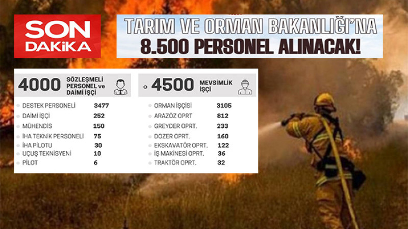 Tarım ve Orman Bakanlığı personel alımı kapsamında; 3.105 yangın işçisi, 3.477 destek personeli ve 150 mühendis olmak üzere toplam 8.500 kişi istihdam edilecek.